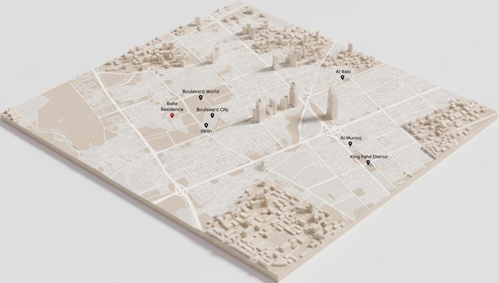 Situated in the heart of Hittin, Al Rafia Residence enjoys a strategic location along the Hittin–Diriyah axis, placing residents minutes from Boulevard City, Diriyah Gate, and major urban connections.